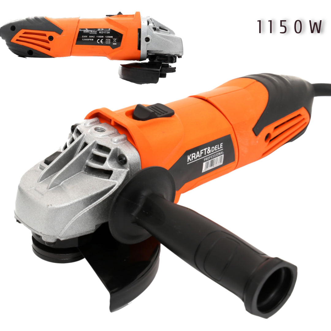 Kraft & Dele kutna brusilica namijenjena za rezanje, brušenje i poliranje materijala kao što su metal, drvo, beton, plastika, keramika, kamen i mnogi drugi. Opremljen je motorom snage 1150W, što mu omogućuje uporabu svih vrsta diskova, četkica i brusnih diskova promjera do 125 mm. Snaga motora omogućuje brzinu rotacije od 12000 okr / min.