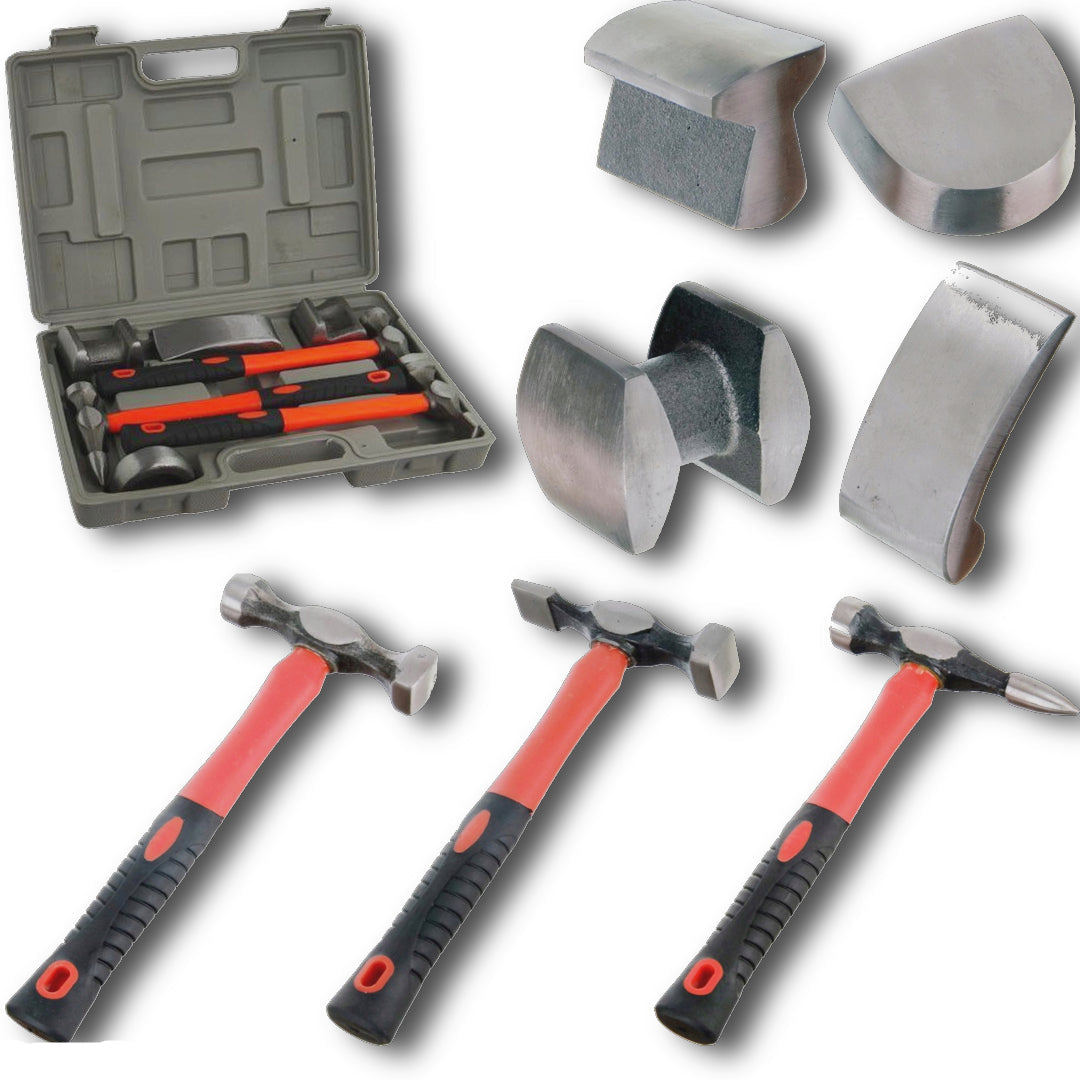 7-dijelni komplet limarskih čekića idealan je za samostalno i profesionalno korištenje. Kovčeg sadrži 3 čekića i 4 nakovnja različitog oblika, što omogućuje obradu složenih metalnih površina. Čekići imaju odrške od stakloplastike, vrlo otporne na oštećenja, što je važno pri radu u radionici. Opremljeni su nekliznom, pravilno profiliranom ručkom, zahvaljujući kojoj se proizvod čvrsto uklapa u vašu ruku.