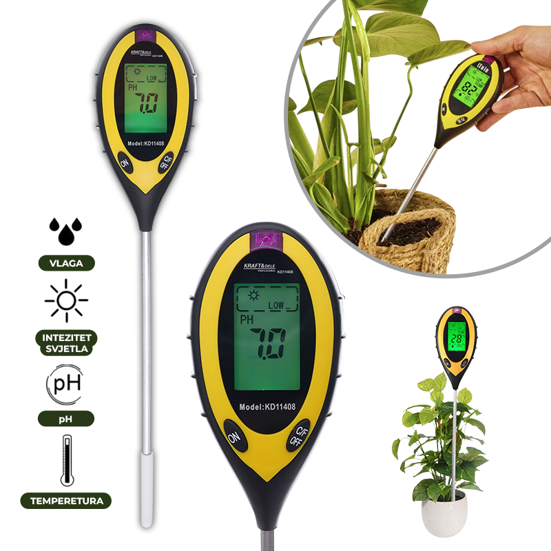 Svestrani mjerač kakvoće tla 4u1 - mjerenje vlage, pH, tempereture i inteziteta svjetla omogućuje brzo i precizno očitanje ključnih parametara tla: vlažnosti, pH vrijednosti, temperature i količine sunčevog svjetla. Dugotrajna sonda dužine 200 mm prodire dovoljno duboko za reprezentativne uzorke tla, a veliki LCD zaslon jasno prikazuje sve podatke. Automatsko isključivanje i indikator slabe baterije čuvaju energiju kako biste se mogli usredotočiti na uspješno uzgajanje biljaka.