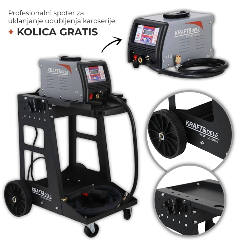 Profesionalni uređaj za izvlačenje i ravnanje udubljenja na karoserijama metodom točkastog zavarivanja. Zahvaljujući visokoj snazi i jednostavnom rukovanju, idealan je za autolimarske radionice i servise. Komplet uključuje praktična kolica i bogat pribor za sve vrste popravaka.